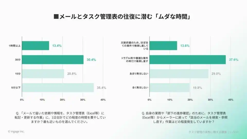 1. ツール分断による「検索・転記」の二度手間 ビジネスの現場では、顧客からの依頼(メール)を受けてから、社内調整や資料作成などの「タスク」が発生します。しかし、メールとタスク管理ツールが別々であるために、メールが届くたびに内容を読み取り、手作業で管理表へ転記・更新する手間が発生しています。事実、51.2%の職場で、タスク内容を確認するためにわざわざ過去のメールを検索し直すという「情報の分断コスト」が常態化しています。 |
