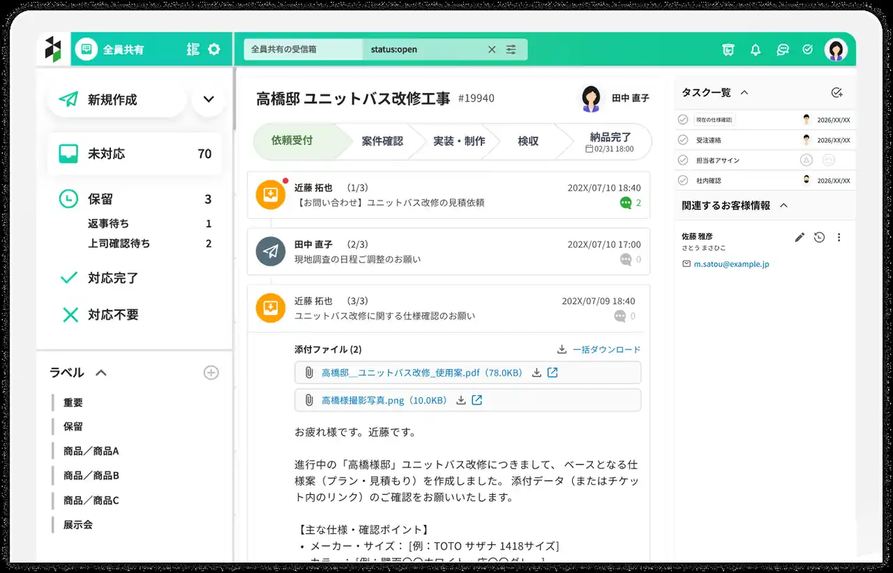 1.メールとタスクの一体化により「画面遷移」をゼロに 日常的に使用するメール対応画面の中で、そのままタスクの登録や進捗管理が完結するため、別のツールへ切り替える必要がありません。これにより、外部ツールへの転記や、詳細把握のためにメールを検索し直す手間がなくなります。「情報の分断」による二度手間を根本から排除します。 |