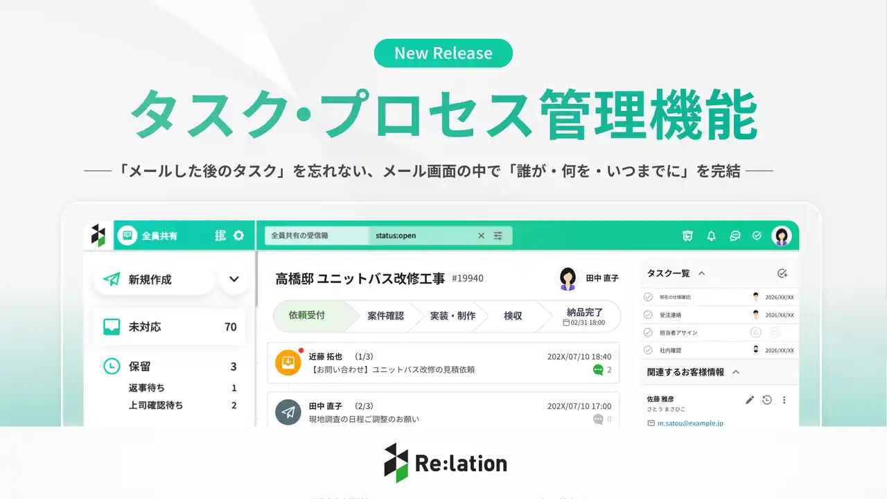 | 株式会社インゲージ(本社:大阪府大阪市、代表取締役社長:和田 哲也)が提供するコミュニケーションプラットフォ-ム「Re:lation(リレーション)」は、新機能「タスク管理・プロセス管理」をリリースしたことをお知らせいたします。これにより、従来別々のツールで行われていた「顧客対応」と「進捗管理」の一本化を実現することで、『メールは見るが、タスク管理ツールは開かない』現場のラストワンマイルを解消し、業務効率化に貢献いたします。 | |||