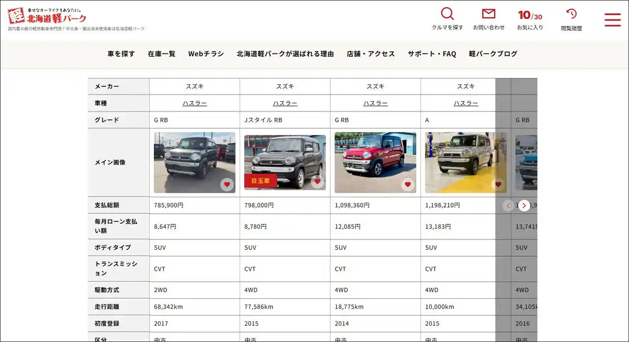 | 年間1万台以上の対応実績を背景に、最大30台同時比較機能を新たに実装し、北海道特有の使用環境を踏まえた車選びをより効率的に行えるサイトへ刷新しています。 | |||