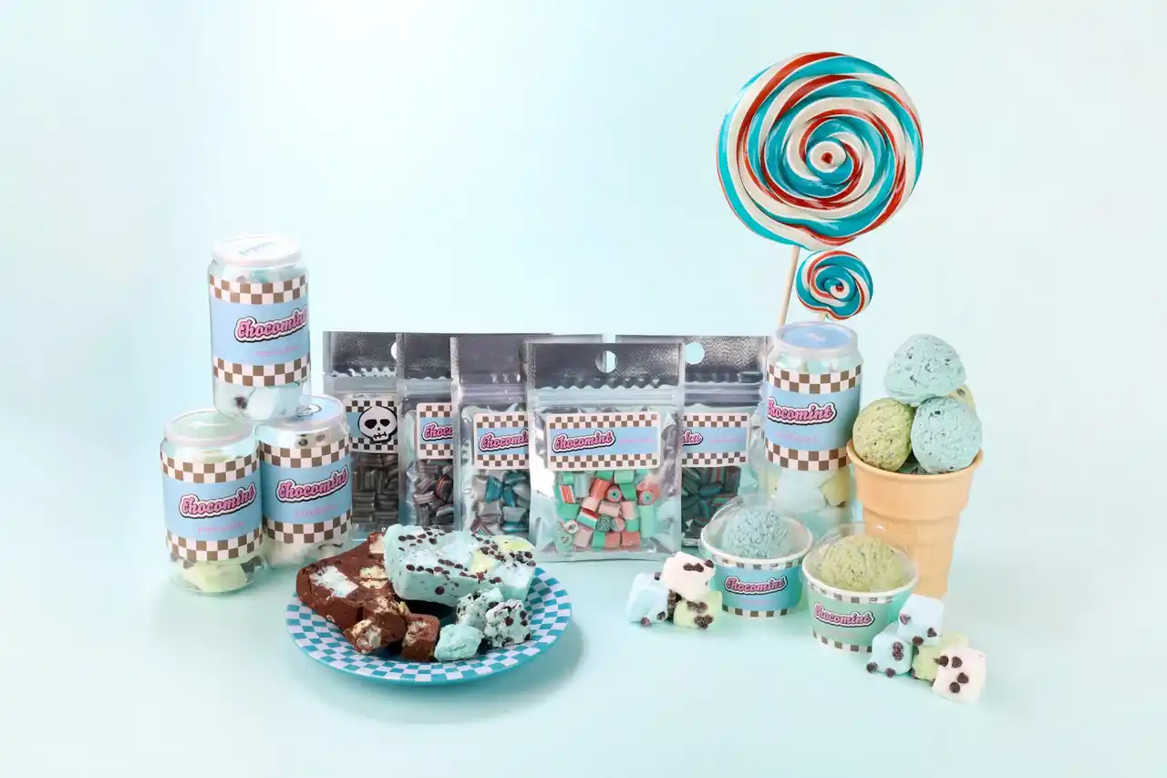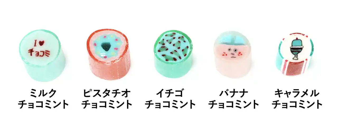 今年のチョコミントミックスは、アイスクリームショップやレトロなダイナーメニューを思わせる世界観の中で、ドーナツやパフェといったポップなスイーツモチーフをキャンディの中に描き出しました。 |