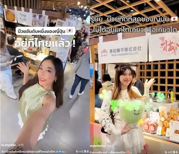 本イベントの広報宣伝にあたり、タイでも利用率の高いTikTokを活用し、インフルエンサーらによる告知プロモーションを実施しました。特に、日本旅行や海外トレンド、食品などに関心の高いフォロワーを有するインフルエンサーを10名厳選し、イベント会場での動画紹介や試食実況、プレゼント企画の告知などを通じて、効果的な集客を実現しました。また、単なる販売にとどまらず、会場では南高梅の歴史や生産者の想い、製造過程でのこだわりなどを動画やパンフレットでも紹介し、インフルエンサーを通じてタイの若い消費者層へアピールすることにも注力いたしました。 |