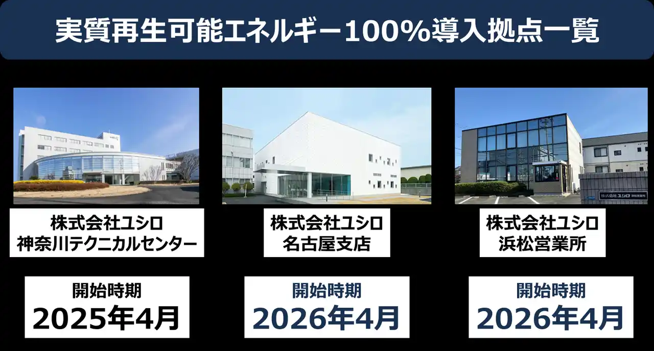株式会社ユシロ(本社:東京都大田区、代表取締役社長:有坂昌規、以下、ユシロ)は、2026年4月から当社の名古屋支店および浜松営業所において、エネルギー・住まい・暮らしの総合サービス事業を提供するシナネンホールディングス株式会社(本社:東京都品川区、代表取締役 社長執行役員:中込 太郎)の子会社で、エネルギーソリューションを提供するシナネン株式会社(本社:東京都品川区、代表取締役社長:中川 進弘)が供給する実質再生可能エネルギー比率100%の電力の使用を開始いたします。 |