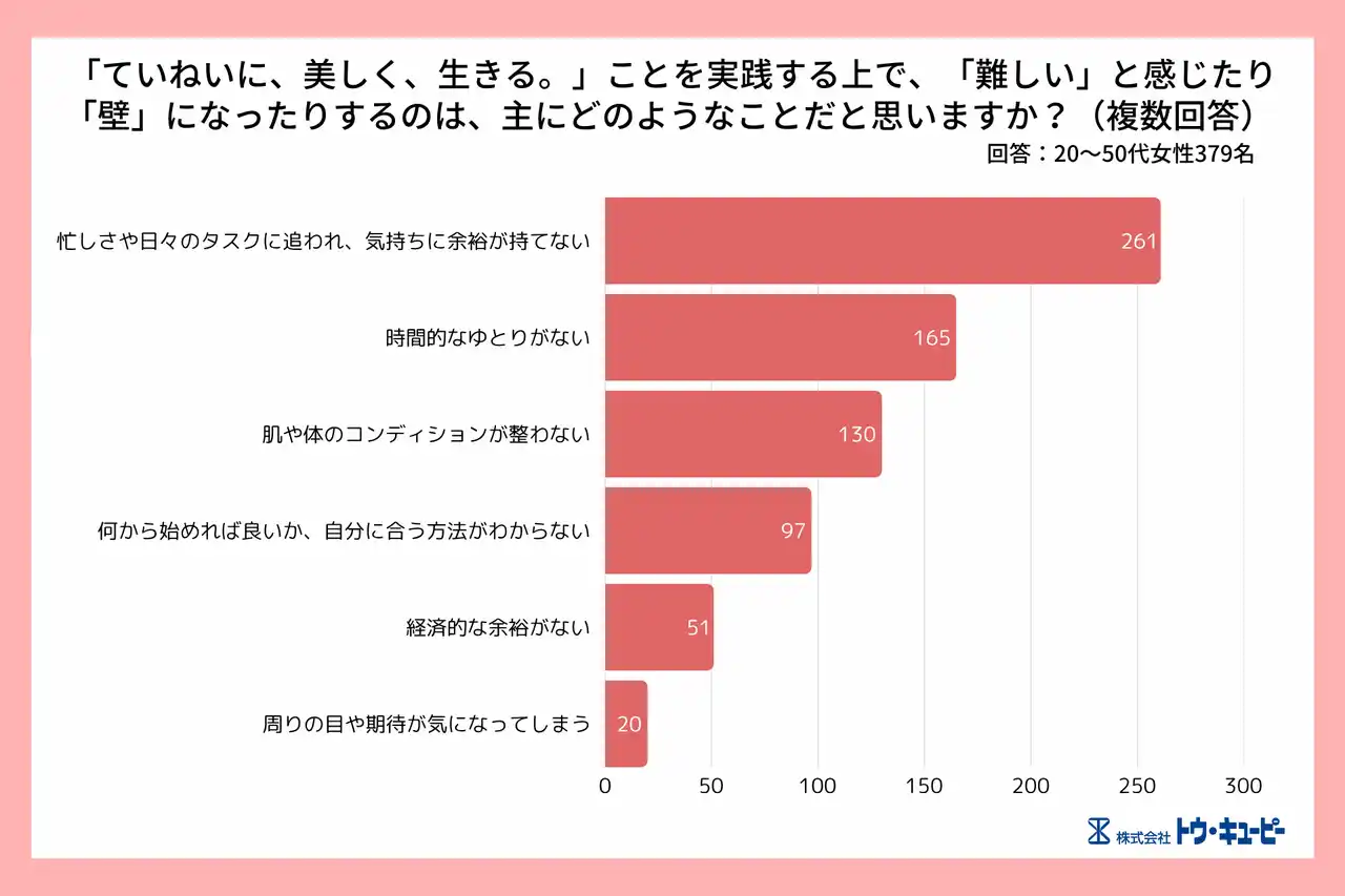 本調査から、「ていねいに、美しく、生きる。」という価値観は多くの女性に広く浸透している一方で、実践には「心の余裕のなさ」という課題があることが明らかになりました。 |