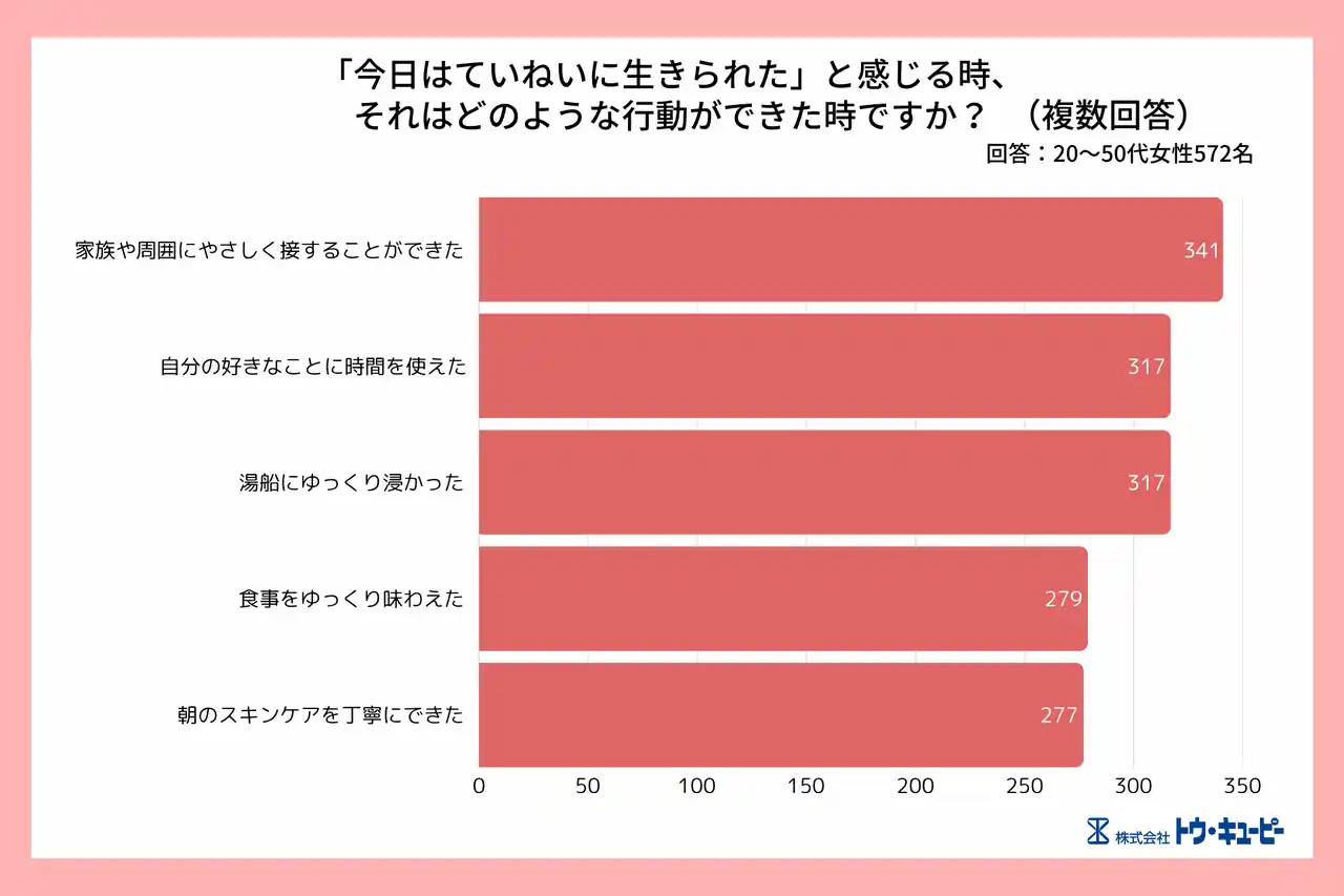 「家族や周囲にやさしく接することができた」(59.6%)が最多。次いで「自分の好きなことに時間を使えた」(55.4%)、「湯船にゆっくり浸かった」(55.4%)、「朝のスキンケアを丁寧にできた」(48.4%)が続きました。 |