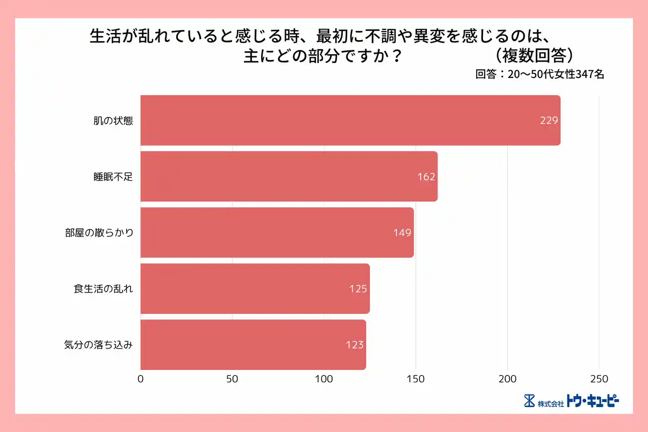 「肌の状態」(60.4%)が最多となり、「睡眠不足」(42.7%)や「部屋の散らかり」(39.3%)、「気分の落ち込み」(32.5%)を上回る結果となりました。 |