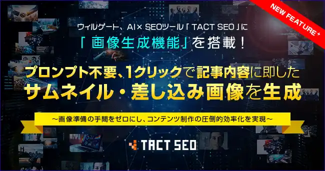 | 株式会社ウィルゲート(本社:東京都港区、代表取締役:小島 梨揮、以下「ウィルゲート」)が提供するAI×SEOツール「TACT SEO」は、簡単SEO記事作成機能にて、「画像生成機能」を新たに追加し、提供を開始したことをお知らせいたします。 | ||||||