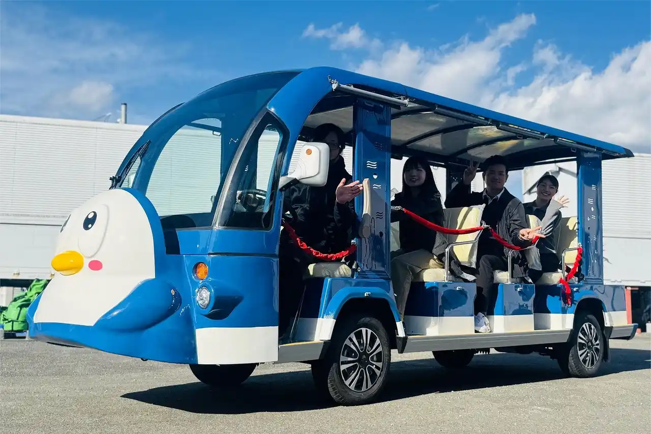 最大10人乗りで全席シートベルトを完備。排気のにおいやエンジン音がないため、屋内施設やフードイベント、動物と触れ合う会場でも安心・安全に運行できます。 |
