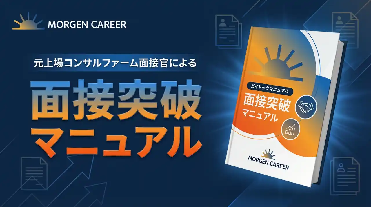 現在、無料キャリア相談にお申し込みいただいた方全員に、元上場コンサルファーム面接官が監修した「面接突破マニュアル」を無料でプレゼントしています。 |