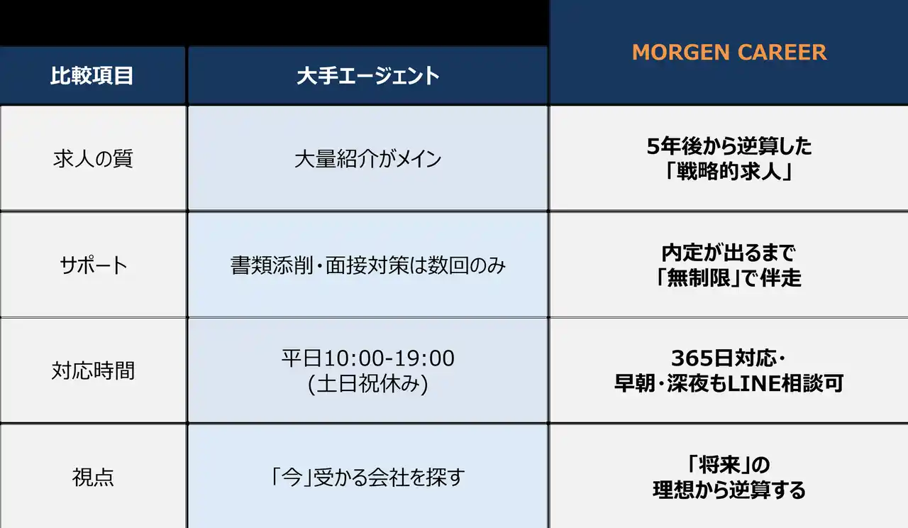 MORGEN CAREERは、こうした「何から手をつければいいかわからない」という不安に対し、単なる求人紹介ではない「5年後の理想を逆算した戦略」を提供することで、停滞したキャリアを打破するきっかけを作ります。 |