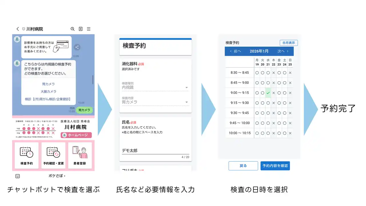 患者は、川村病院のLINE公式アカウントから「Med-Well」を通じて、内視鏡検査の予約を行うことができます。電話対応や窓口手続きを必要とせず、24時間いつでも予約が可能です。 |