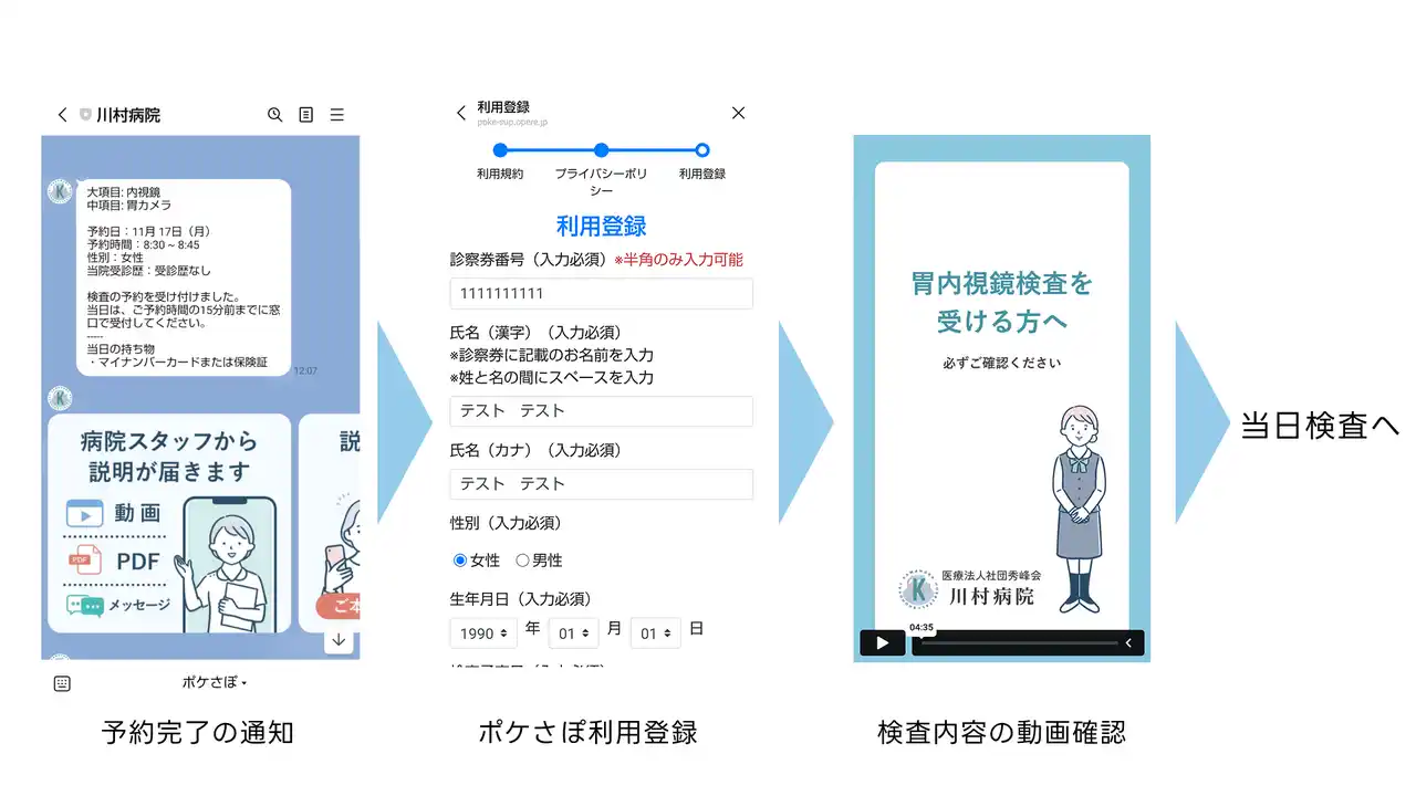 予約後は、OPEReが提供する「ポケさぽ」による検査説明動画をLINE上で視聴することができ、検査の流れや注意事項を事前に把握できます。これにより、患者の不安軽減と理解促進を図ります。 |