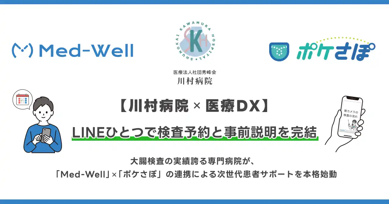 コモン・クリエーション株式会社(本社:福岡県福岡市、代表取締役:牟田和貴)は、当社が提供する予約システム「Med-Well(メドウェル)」が、医療法人社団秀峰会川村病院(所在地:静岡県富士市)に採用され、2026年3月16日よりLINE公式アカウントを活用した内視鏡検査のLINE予約サービスの提供を開始したことをお知らせします。 |