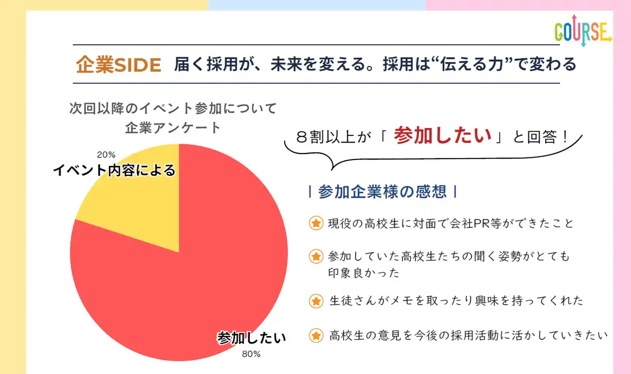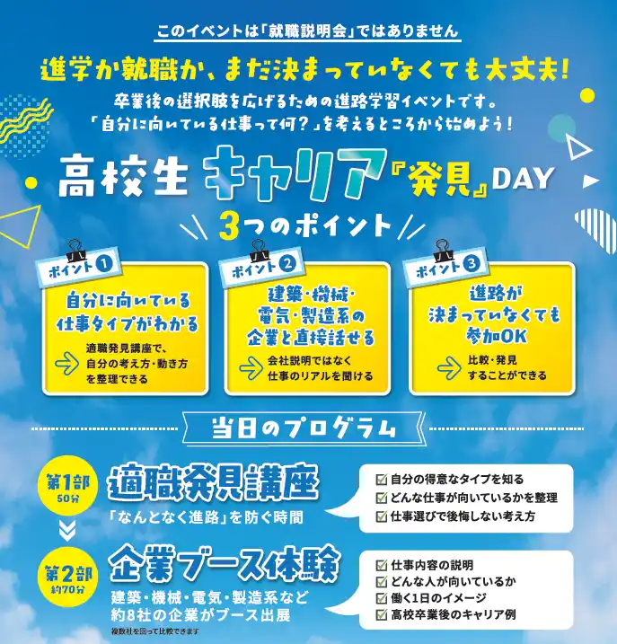 1.適職発見講座: 自分の得意なタイプを知る、どんな仕事が向いているかを整理、仕事選びで後悔しない考え方など。 2.企業ブース体験: 8社の担当者による「仕事のリアル」が聞ける対話タイム。働く1日のイメージ、高校卒業後のキャリア例など。 |