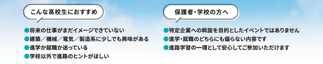 第2回の開催では、これまでのキャリアイベントに多かった「広く浅く知る」ではなく、あえて【建築・機械・電気・製造】の4分野に絞り込みより深く知るを創出することにしました。 |