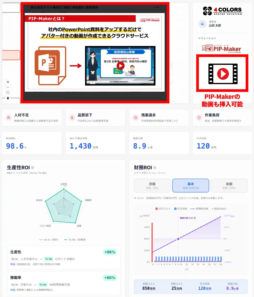 株式会社4COLORS(本社:神奈川県横浜市、代表取締役:加山 緑郎)は、2026年4月1日、業務課題をひとこと入力するだけで、AIが費用対効果(ROI)を可視化し、「工数20%削減」や「ROI 300%」といった説得力のある解決提案書をスピーディーに自動生成・共有できる『ROI-Maker』を正式リリースしました。 |