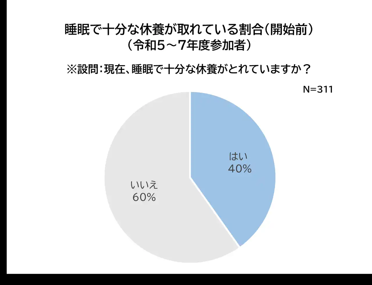 ・ 参加前の質問で「睡眠で十分な休養が取れていない」と回答した方が半数以上 |