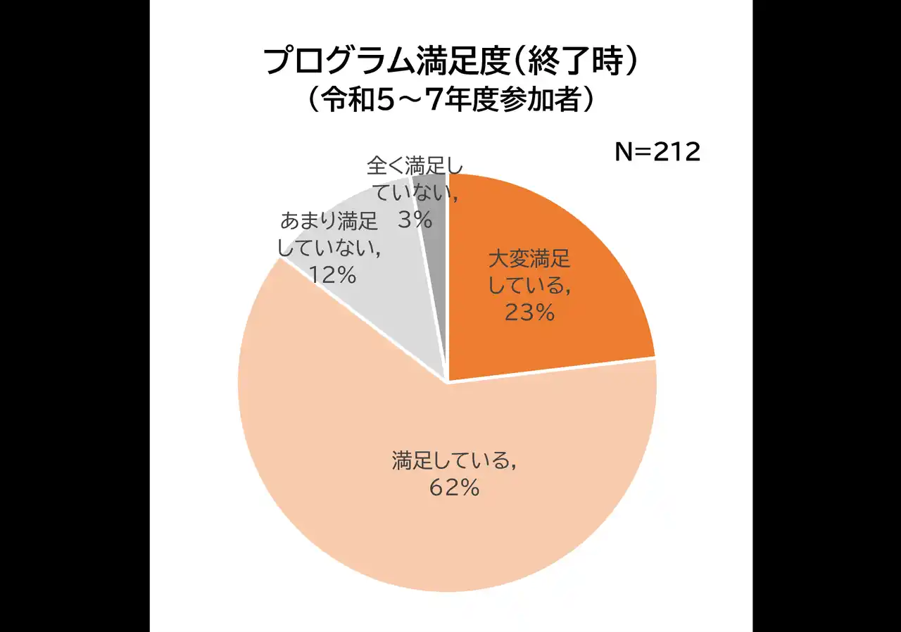 本事業に関する満足度を終了時アンケートにて確認したところ、85%の参加者が「大変満足している」「満足している」と回答しており、プログラム全体に対する高い評価が確認されました。 |