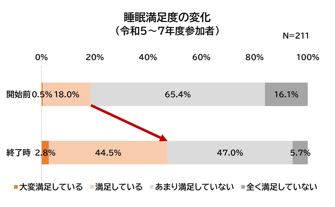 本事業の開始前と終了時の睡眠満足度を比較したところ、「睡眠に満足している」と回答した割合は、開始前18.5%から終了時47.3%へと大きく増加しました。 |