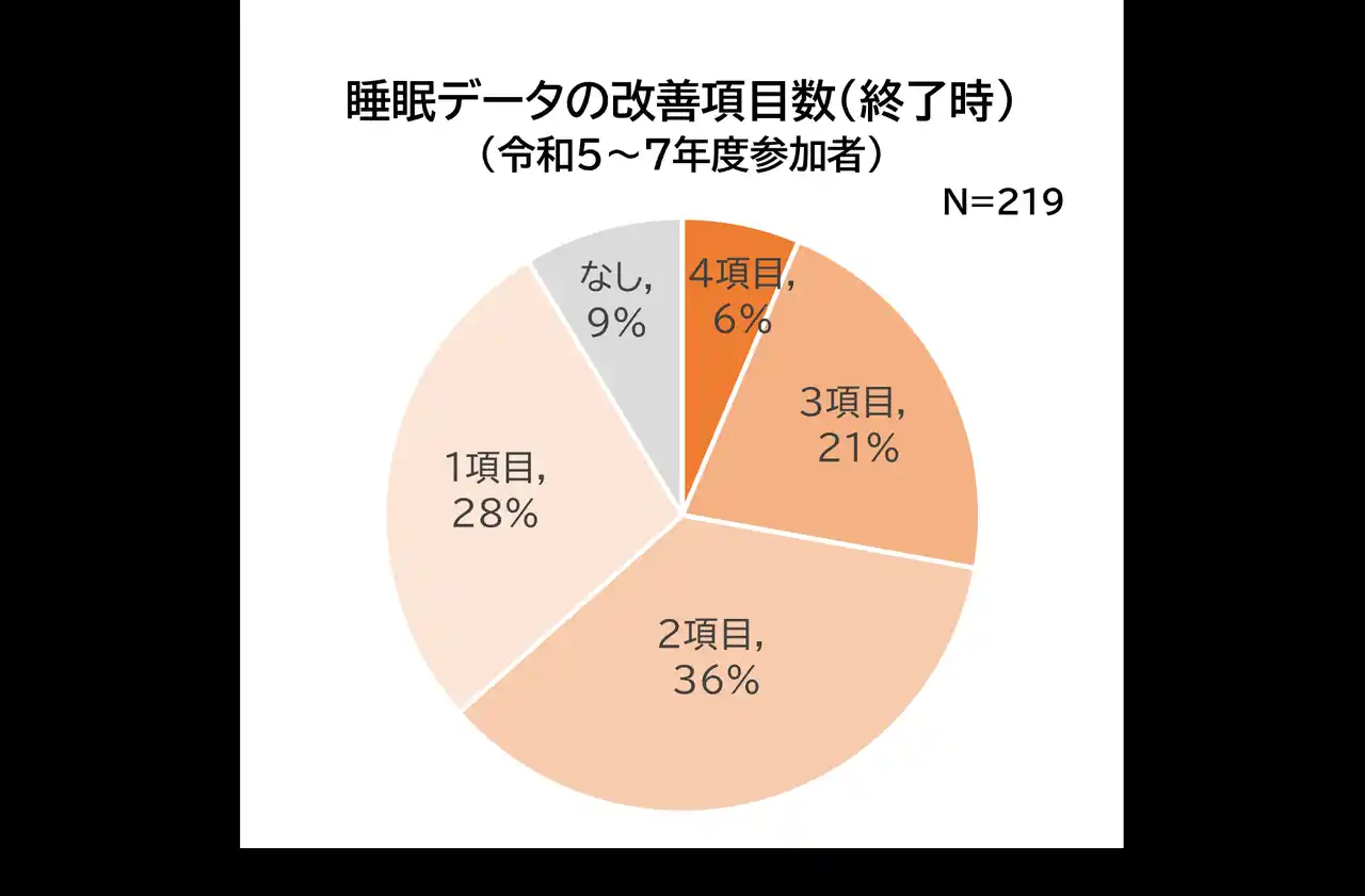 その結果、4項目のうち1つ以上に改善が見られた参加者は91%で、ほとんどの参加者で客観的な睡眠データの改善が確認されました。 |