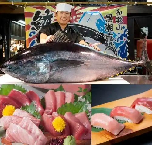黒潮市場名物「生マグロの解体ショー」は毎日開催! 「プレミア和歌山(和歌山県 優良県産品)」にも認定されている、串本町のブランド鮪「南紀串本 よしだ本鮪」を中心に、最高級部位・大トロが |