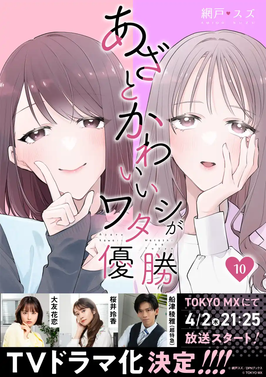 【タイトル】 あざとかわいいワタシが優勝 【放送日時】 TOKYO MX 4月2日(木)より毎週木曜21:25~21:54 (TOKYO MX1) 群馬テレビ 4月2日(木)より毎週木曜23:00~23:30 福岡放送 4月4日(土)より毎週土曜25:00~25:30 テレビ岩手 4月5日(日)より毎週日曜25:25~25:55 とちぎテレビ 4月7日(火)より毎週火曜23:30~24:00 【出演】 大友花恋、 船津稜雅(超特急)、桜井玲香 【原作】 網戸スズ『あざとかわいいワタシが優勝』(DPNブックス) 【監督】 瀬野尾一 【脚本】 村田こけし 【制作プロダクション】 トータルメディアコミュニケーション 【製作・著作】 TOKYO MX 【配信】 TVerにて無料見逃し配信、FODにて見放題配信 【公式HP】 https://s.mxtv.jp/drama/azakawa-yusho/ 【公式SNS】 ▼X(@mx_dramania2) https://x.com/mx_dramania2 ▼Instagram(@mx_dramania) https://www.instagram.com/mx_dramania ▼TikTok(@mx_dramania) https://www.tiktok.com/@mx_dramania 【公式ハッシュタグ】 #あざかわ優勝 |