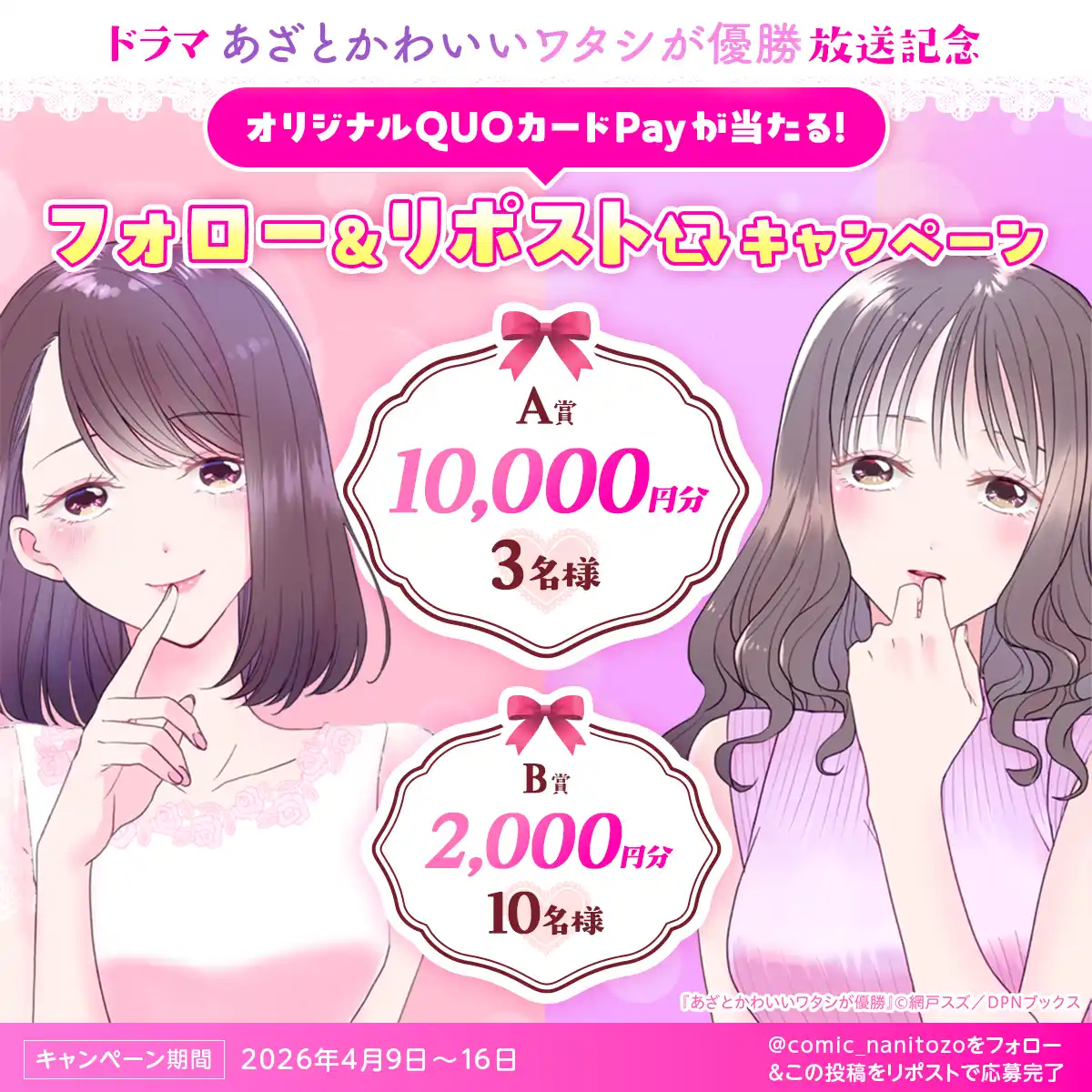 DPNブックスの人気作品『あざとかわいいワタシが優勝』(著:網戸スズ)の実写ドラマ放送を記念し、各電子書店での無料話増量キャンペーン、なにとぞ編集部公式Xでのプレゼントキャンペーンなど様々なキャンペーンを開催中です! ドラマとあわせて、ぜひ原作もお楽しみください |