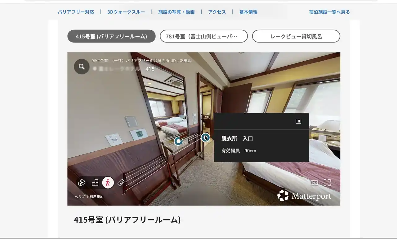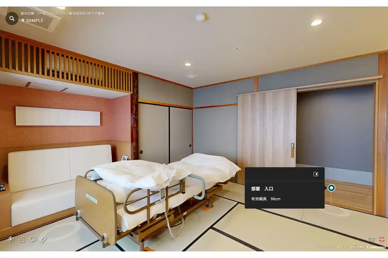 客室の状況を全国統一基準で整理し、3D画像や実測データ、簡潔なテキストを用いて、段差の高さや開口幅、浴室・トイレの状況など、身体状況に応じた判断に必要な情報を可視化しています。 |