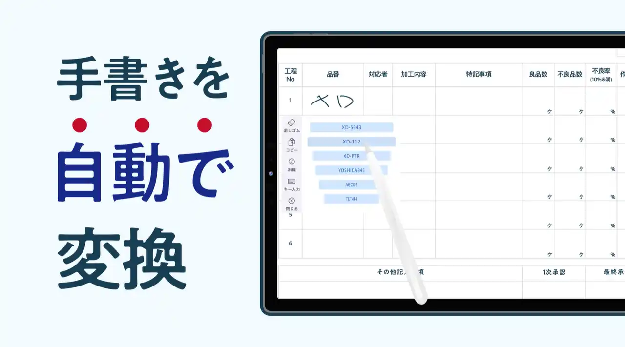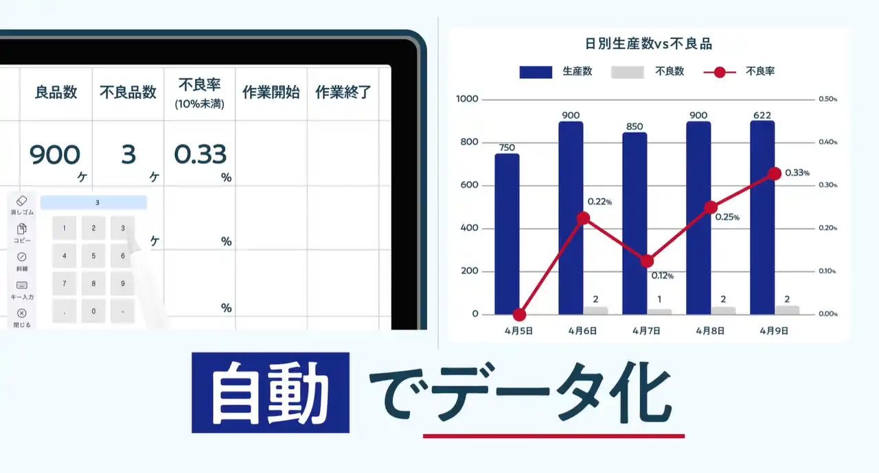 手書きの文字を自動で変換し、リアルタイムでデータ化します。さらに、日別の生産数や不良率などのグラフも自動で作成されるため、これまで手作業で行っていた面倒なExcelへの転記や資料作成の工数を大幅に削減します。 |
