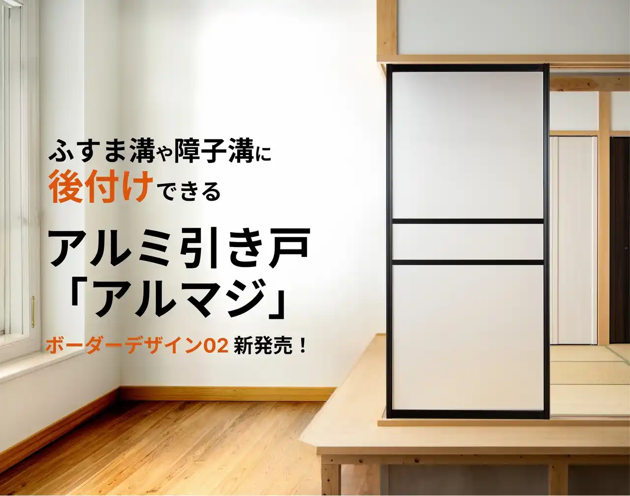 | 同社のアルミ引き戸は、古い襖や障子が入っている和室でも、既存の枠を撤去することなく設置できる点が特徴です。今回の新デザイン追加により、より幅広いインテリアニーズに対応できるようになりました。 | |||