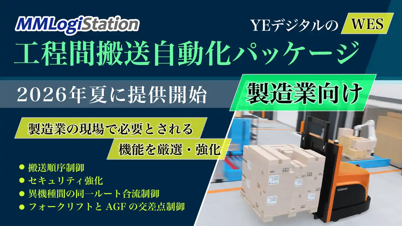 株式会社YE DIGITAL(本社:北九州市小倉北区、代表取締役社長:玉井裕治、以下 YEデジタル)は、倉庫自動化システム(WES)「MMLogiStation」より、製造業向け「工程間搬送自動化パッケージ」を、2026年夏に提供開始します。 |
