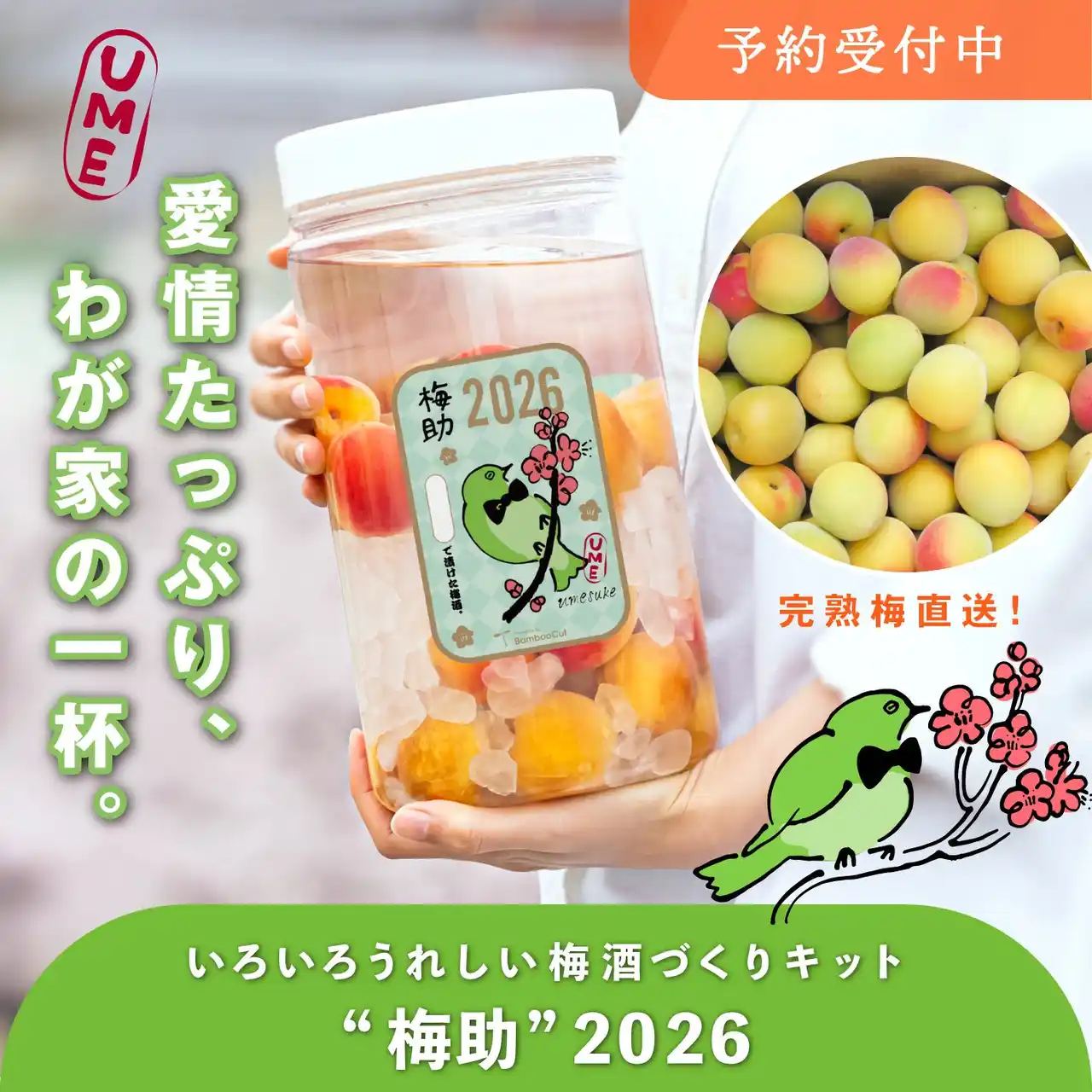 東京ソラマチの「立ち喰い梅干し屋」「ぐるぐるしゃかしゃか」や浅草の「梅と星」を企画運営しているBambooCut(株式会社バンブーカット)がプロデュースする『だれでもおいしく梅干しづくりキット“梅子”』と『いろいろうれしい梅酒づくりキット“梅助”』。 |