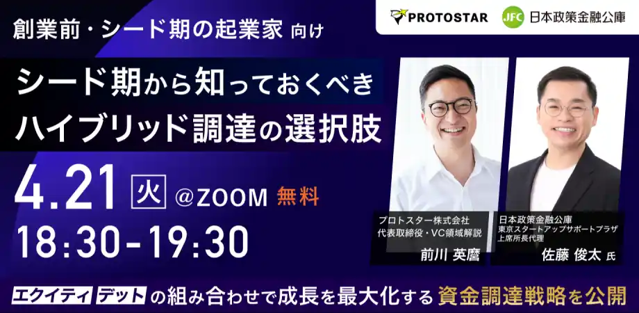 挑戦者支援をミッションに掲げるプロトスター株式会社(本社:東京都中央区、代表取締役:前川英麿)は、2026年4月21日(火)に創業前およびシード期の起業家向けて、オンラインセミナー「シード期から知っておくべきハイブリッド調達の選択肢~エクイティとデットの最適な組み合わせとは~」を開催いたします。 |