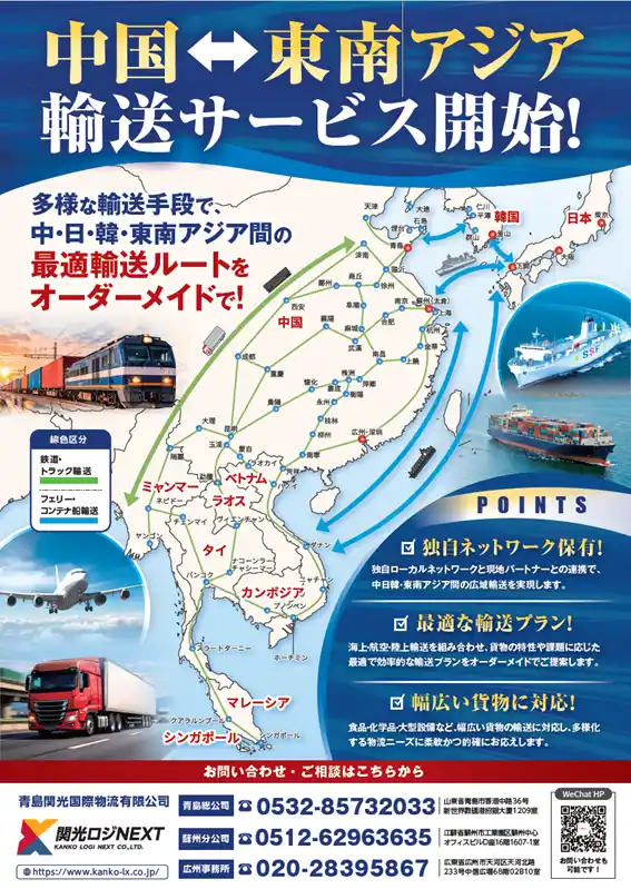 関光ロジNEXT(株)(代表取締役社長 入谷一成/以下「関光ロジNEXT」)は、この度、中国と東南アジアを結ぶ新たな輸送サービスを開始いたしました 。多様な輸送手段を駆使し、中国、日本、韓国、そして東南アジア間の最適な輸送ルートをお客様のニーズに合わせてオーダーメイドで提供いたします。 |