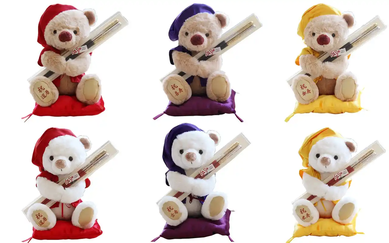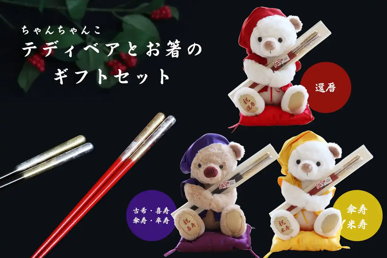 | 還暦(赤)、古希(紫)、米寿(黄)など、それぞれの節目を象徴するちゃんちゃんこを纏ったテディベアと、日本の匠が手掛ける「祝い箸」を組み合わせた本シリーズは、2025年の発売以来「思い出に残るだけでなく、毎日使える」と多くの支持をいただいています。 | ||||||||||||||