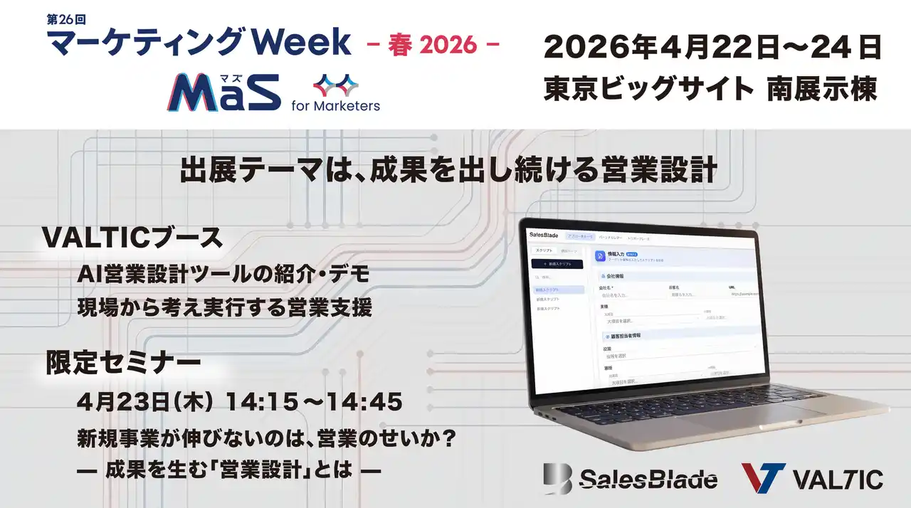 株式会社VALTIC(本社:東京都品川区、代表取締役CEO:鍋島慎吾)は、2026年4月22日~24日に開催される「第26回 マーケティングWeek -春 2026-(営業支援EXPO)」に出展いたします。 |