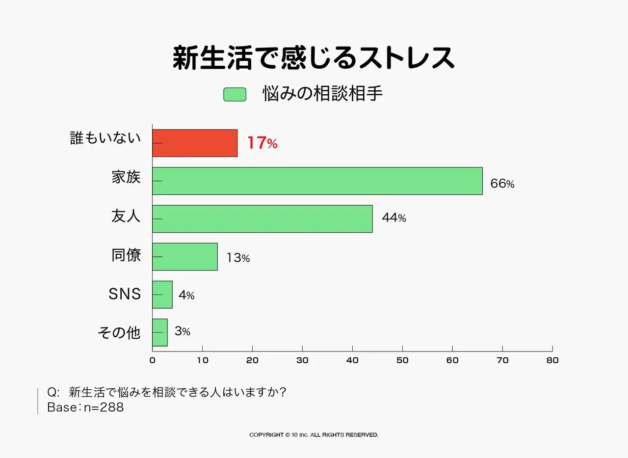 | さらに、悩みを相談できる相手については、「誰もいない」(17%)と、約6人に1人が相談相手を持たない状態にあることも確認されました。人間関係がストレスの主な要因である一方で、孤独を感じる人も一定数存在していることが明らかになりました。これは、新しい環境における関係構築のプロセスそのものが心理的負荷となっている可能性が示唆されます。 | |||||||||