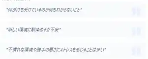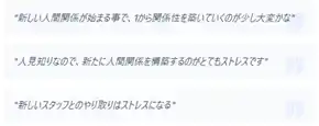 | また、具体的なストレス言及では、新生活に伴うストレスの源泉は、対人関係の再構築や未知の環境への適応、業務上のプレッシャーなど多岐にわたります。多くの回答者は、新しいコミュニティでの信頼形成や、不慣れな職場環境への順応プロセスに多大な精神的エネルギーを費やしています。 | |||||||||