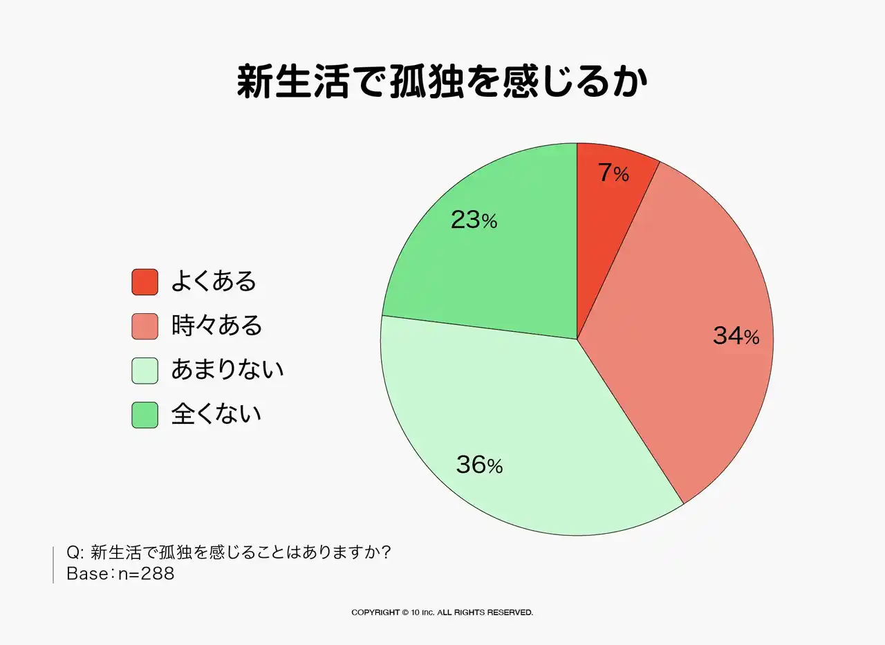 | 一方で、新生活における孤独感については、「よくある」(7%)「時々ある」(34%)と、合計41%が孤独を感じていることが明らかになりました。 | |||||||||