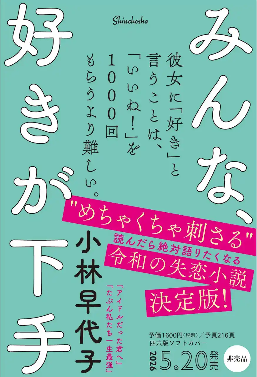 | 『アイドルだった君へ』『たぶん私たち一生最強』で、読者の心をえぐるキレキレの表現が「めちゃくちゃ刺さる!」と話題の作家、小林早代子さん。令和を生きる大学生を主人公にした唯一無二の失恋小説『みんな、好きが下手』を5月20日に発売いたします。 | |||||||