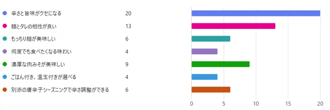 最も多くの票を集めたのは『辛さと旨味がクセになる』というポイントでした。2位は『麺とタレの愛称が良い』、3位は『濃厚な肉みそが美味しい』でした。 |