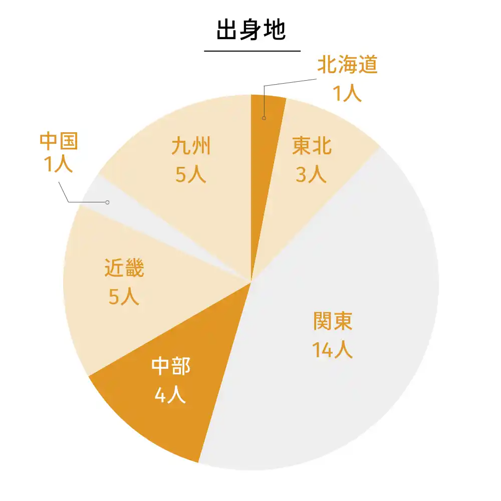 | 日本全国の地方、中堅・中小企業を支援したいという想いとともに北は北海道、南は鹿児島まで、各地から33名の新入社員が集まりました。出身地別にみるとおよそ80%が東京都以外と、日本全国から幅広く集まっています。 | |||
