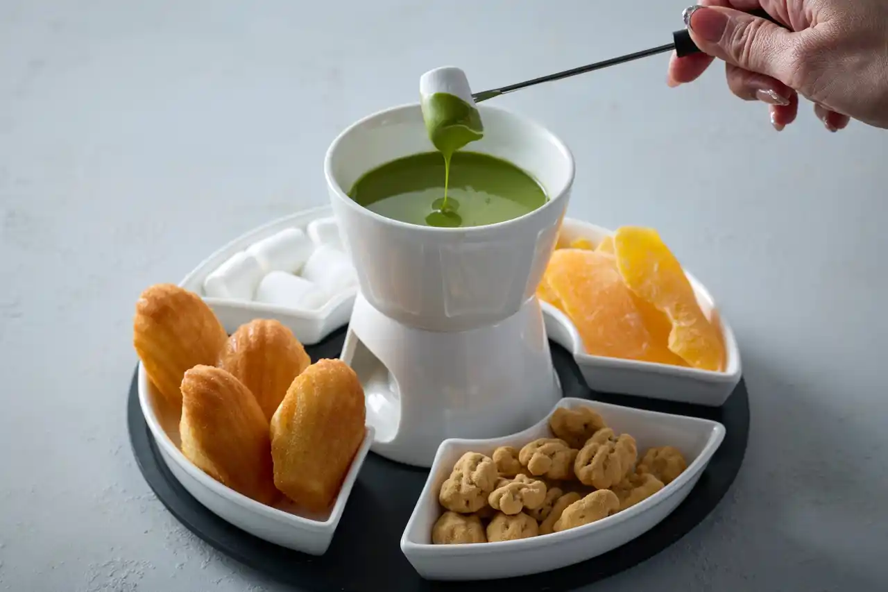テーブルごとにお楽しみいただける抹茶チョコレートフォンデュ(別途料金)もご用意。マシュマロやドライマンゴーをたっぷりと絡めてお召し上がりください。 |