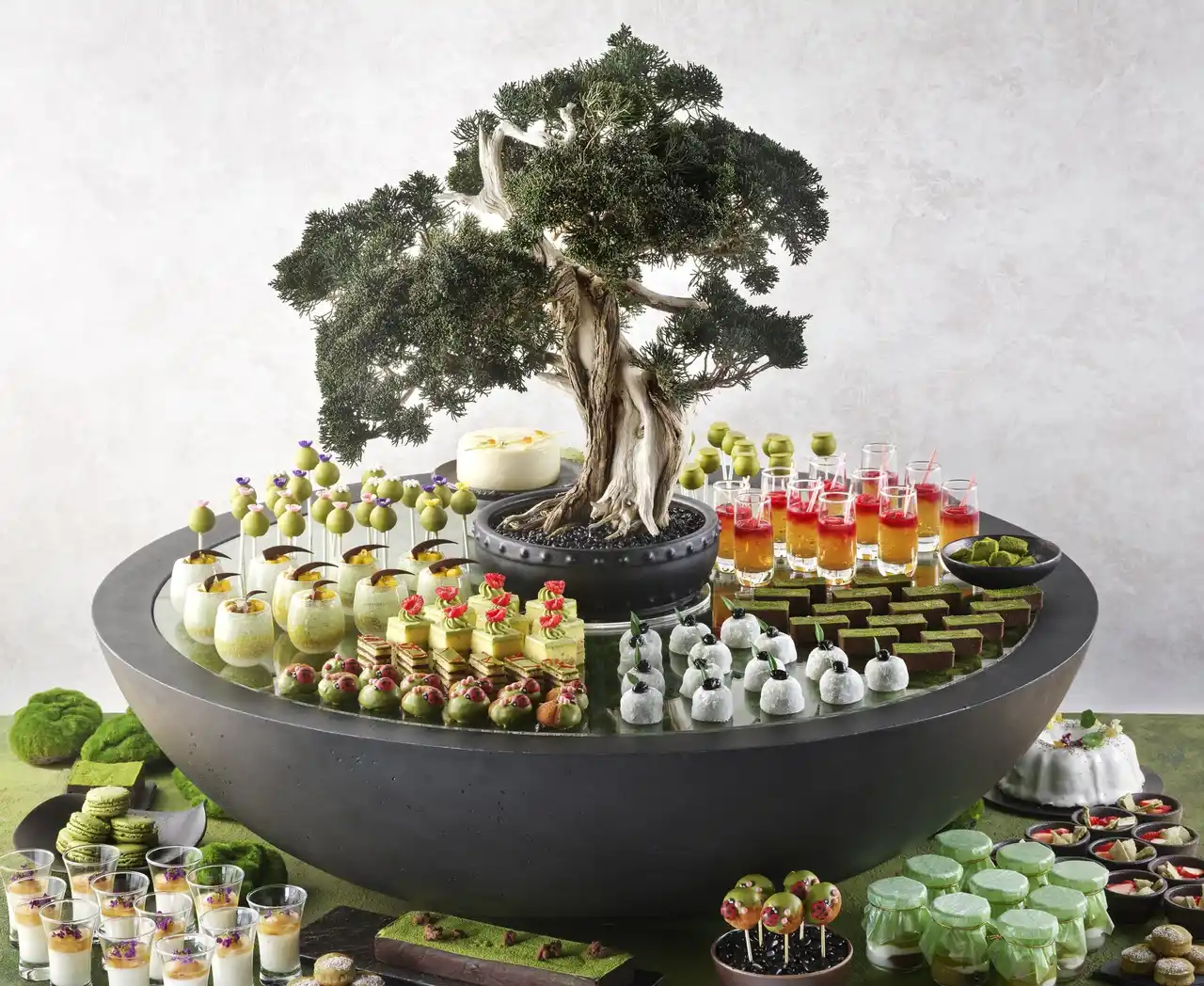 現在開催中の「恋するいちごビュッフェ」でご好評をいただいている、直径約1メートルのシグネチャーボウルが、今回は日本庭園をイメージした装いで登場いたします。ボウル中央でひときわ存在感を放つのは、DRY BONSAI(ドライ盆栽)。一度枯れてしまった盆栽に新たな命を吹き込む再生アートとして、国内外で注目を集めています。グリーンキー認証を取得し、サステナブルな取り組みを大切にするウェスティンホテル横浜の理念とも深く共鳴する存在です。 |