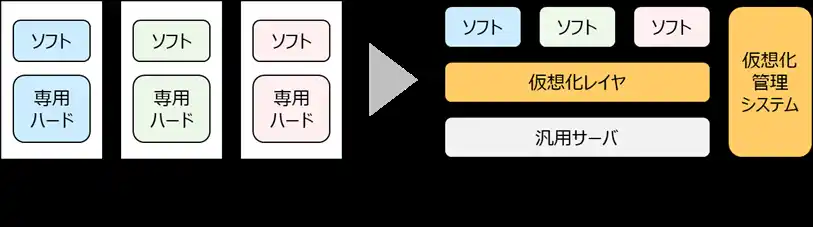 仮想化とは、コアネットワークを構成する各種機能を、専用装置ではなく汎用的なサーバ上に仮想化 レイヤ(ハイパーバイザやコンテナ仮想化)を導入し、ソフトウェアとして動作させることです。完 全仮想化とは、ネットワークを構成する全ての装置を仮想化することで、ネットワーク全体を柔軟に制 御・運用可能とする仕組みです。これにより、設備構成の変更や機能配置の最適化をソフトウェア制御 で行うことが可能となります。 |