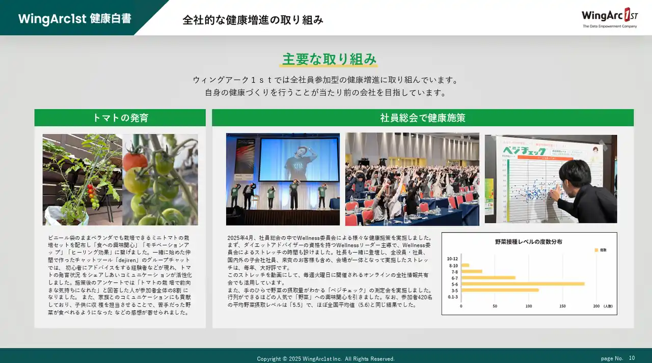 ・経済産業省と東京証券取引所が共同で東京証券取引所の上場会社の中から「健康経営」に優れた企業を選定する「健康経営銘柄2026」に2年連続で選定 ・経済産業省と日本健康会議が顕彰する「健康経営優良法人2026(大規模法人部門:ホワイト500)」として6年連続認定 ・スポーツ庁が推進する、従業員の健康増進のためにスポーツの実施に向けた積極的な取組を行っている企業「スポーツエールカンパニー」に6年連続で認定され、「スポーツエールカンパニー2026」ブロンズとして認定 https://www.wingarc.com/company/wellness.html |