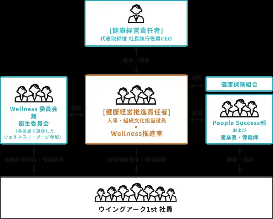 健康経営専属組織「Wellness推進室」を設置し、部署横断で選出されたWellness委員会で健康施策を企画・推進し、社員への浸透を図っています。 当社では、全社員を対象とした産業医・保健師による健康面談を実施しており、面談実施率は100%です。リモートワーク環境でのメンバーの健康管理やメンタル不調の早期発見につなげています。また、衛生委員会を兼ねたWellness委員会では、自社製品を使った健康施策「全社ウォーキング大会」や「Wellness体操」などを企画し「健康づくり×コミュニケーション」をスローガンに全社一丸となって取り組んでいます。 |