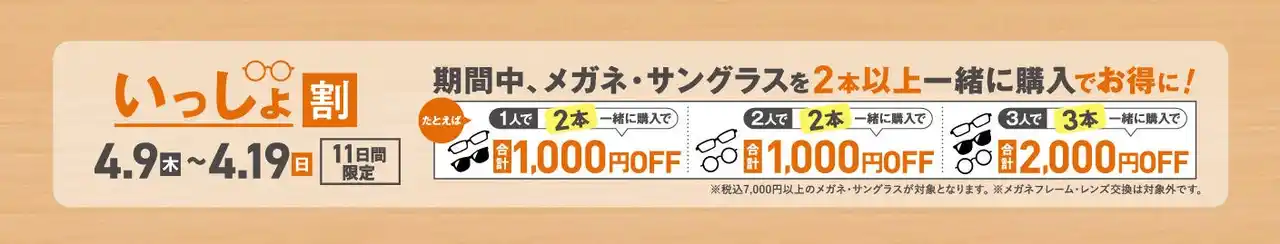 期間中、メガネ・サングラスを2本以上一緒にご購入いただくと、購入本数に応じた特典が受けられます。 |