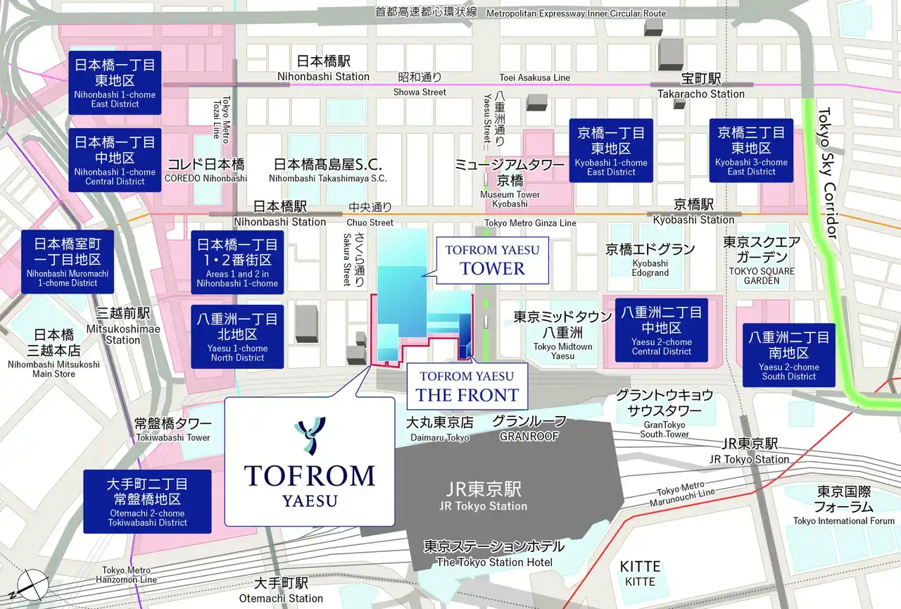 「TOFROM YAESU TOWER」は、東京駅八重洲口前に位置する地下4階、地上51階の大規模複合ビルです。八重洲地下街(ヤエチカ)を通じて東京駅と直結しており、6駅28路線を利用できる首都圏屈指のアクセス性を備えています。今後はすでに開業したバスターミナルに加え、オフィス、商業施設、劇場・カンファレンス、医療施設など、多様な施設が順次開業する予定です。 |