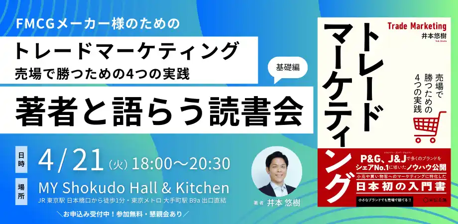 | 今回は、FMCGメーカーにお勤めで、書籍「トレードマーケティング 売場で勝つための4つの実践」をお読みいただいた方、20名限定のイベントです。著者と参加者の皆さま同士がインタラクティブに語らい、学び合い、交流できる、そんな場を目指しています。 | ||||||||||||||||